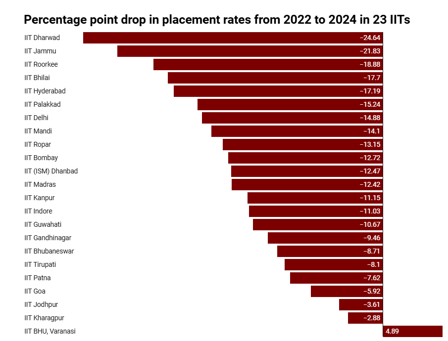 The numbers are not limited to one or two campuses. Data released by the Ministry of Education revealed that 22 out of 23 IITs have seen placement percentages fall between 2021 and 2024. NITs and IIITs, once seen as reliable sources of employable talent, have also reported downward trends.
